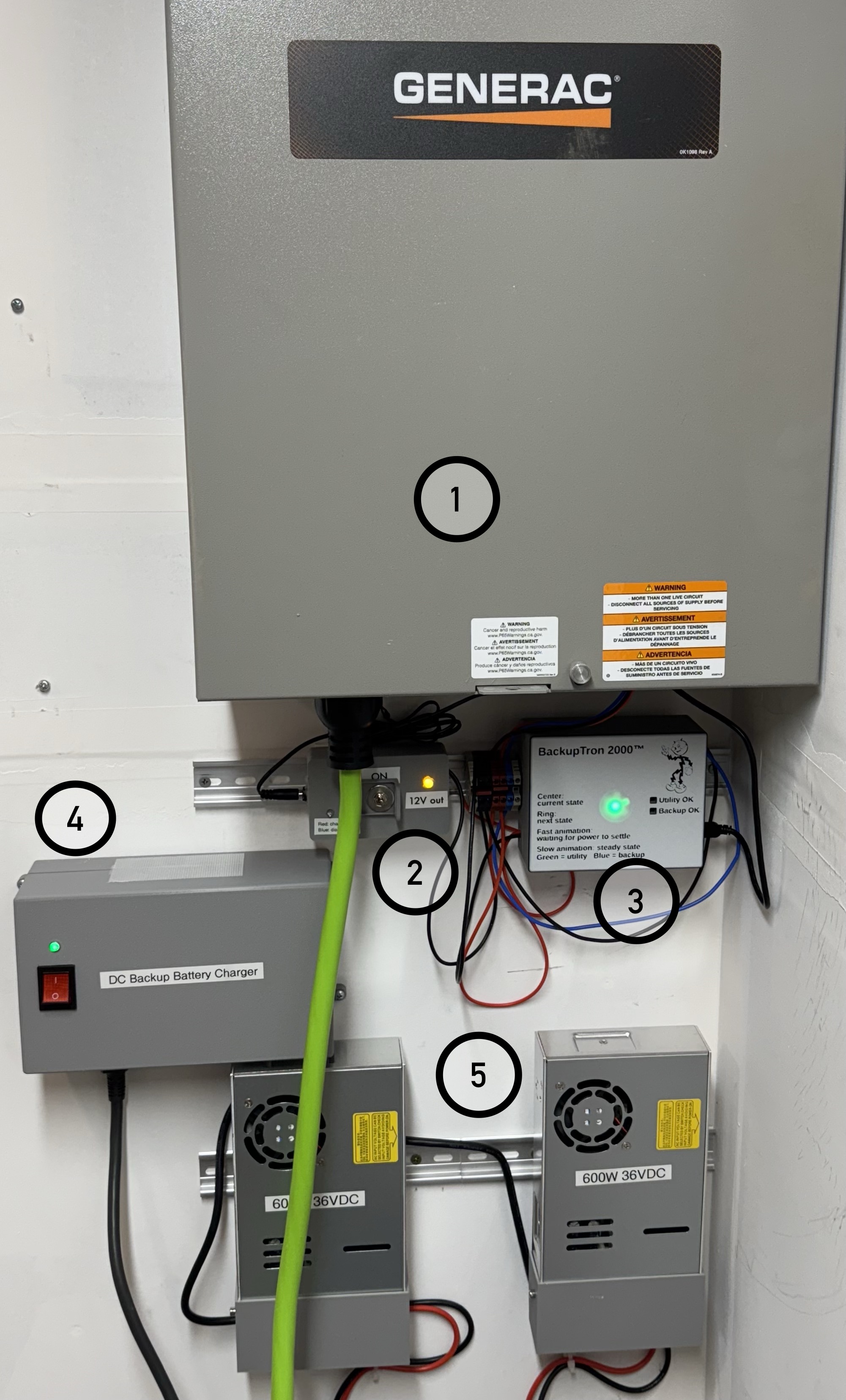The 12V power supply, with a battery backup (2), is below the transfer switch. It’s powered by either utility or backup power, but has a small internal battery so it can keep the controller running while it’s deciding whether or not to switch to backup power.