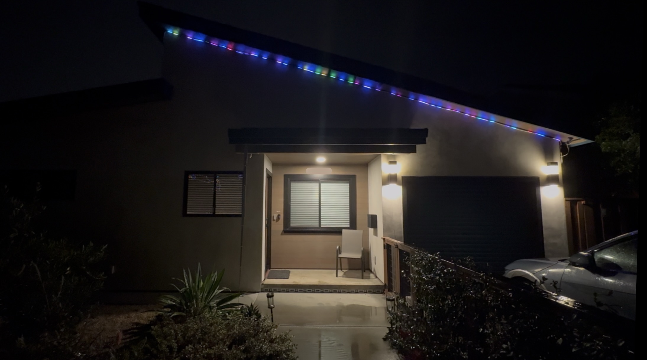 The plan is to have the lights trace around the soffits on the whole house (except the walkway between my house and the neighbor, where it wouldn’t be seen except through their bedroom window). I have another PixelBlaze on order; I think I’ll probably want multiple controllers because there are two disconnected roof lines on the house.